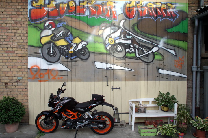 Aber von vorne. Hierzu muss ich ein wenig in der Vergangenheit kramen. Die Lesmo hat ja einen Motorschaden, eigentlich hätte ich sie schon längst verkauft, wenn nicht im Hinterkopf der Gedanke wäre, in das Fahrwerk einen aktuelleren 4-Takt-Single einzupflanzen. Weiterhin fing ich letztes Jahr an, die Beta wieder fit zu machen, um ein kleines Mopped für Zwischendurch zu haben, also auch wieder mit Straßenzulassung. Denn die Beta ist klein genug, damit auch Ingi hin und wieder damit fahren kann. Damals beim Betahändler war eine Beta Alp 200 zu verkaufen. Eigentlich zuckte da schon die Kreditkarte, aber ich konnte mich noch beherrschen. Zum Glück kann ich da nur sagen. Denn am ersten Maisonntag dieses Jahres fuhr ich auf das schon traditionelle Italofrühstück des Stammtisch Münstermaifeld und da sah ich sie, die KTM 390 Duke. Ich kannte sie bisher noch nicht und liess mir kurz darüber berichten. Eigentlich ist das eine 125er nur halt mit 44PS, genauso so etwas hatte ich gesucht. Niedrig und leicht genug, dass auch kleinere Personen damit zurecht kommen. Also kurz darauf zum KTM-Händler, nochmal anprobiert, sie passt und dann bestellt. Am 20.05.2014 konnte ich sie abholen, bin knapp 130 KM damit gefahren und habe abends die folgenden Bilder geschossen.